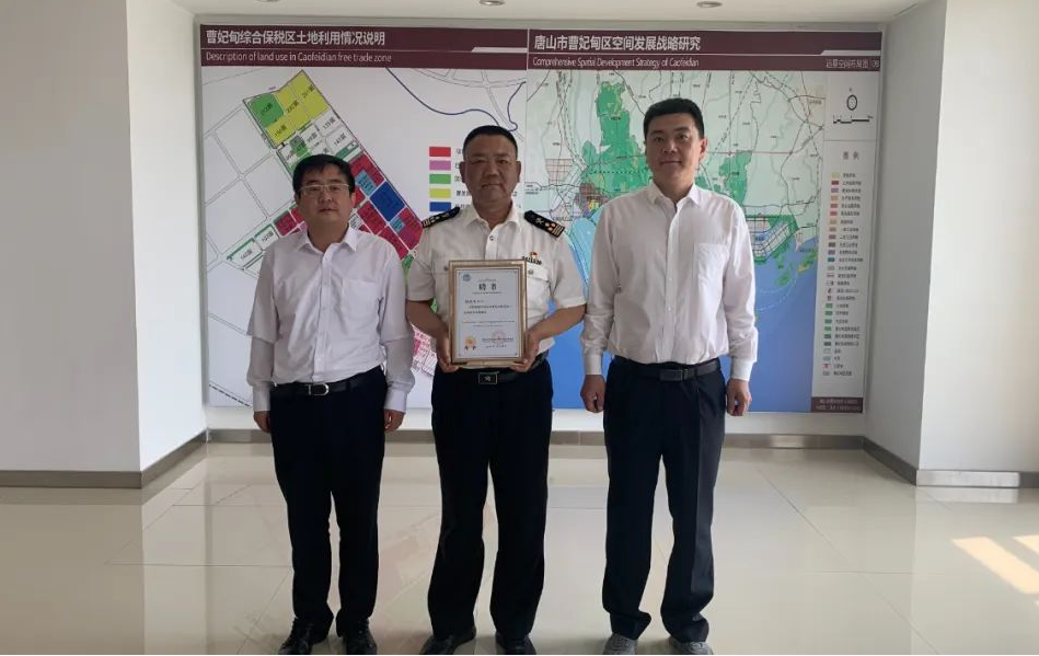 2022年5月18日上午,曹妃甸海关副关长张振贵在综合保税区管委会接受了进出企业协会会长李俊成、副会长张深颁发的“特聘顾问”证书。协会副会长李恩坨和马瑞明一并出席并进行了交流。
